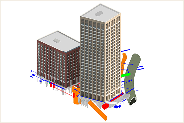 By managing the coordination strategy on Blackwall Reach, we incorporated the location and dimension of a super sewer positioned underneath one of the buildings and the adjacent Docklands Light Railway line into the 3D digital model to coordinate the design with these constraints. This allowed the design team to avoid potential problems with the groundworks package, mitigating delay and unnecessary costs on the project.