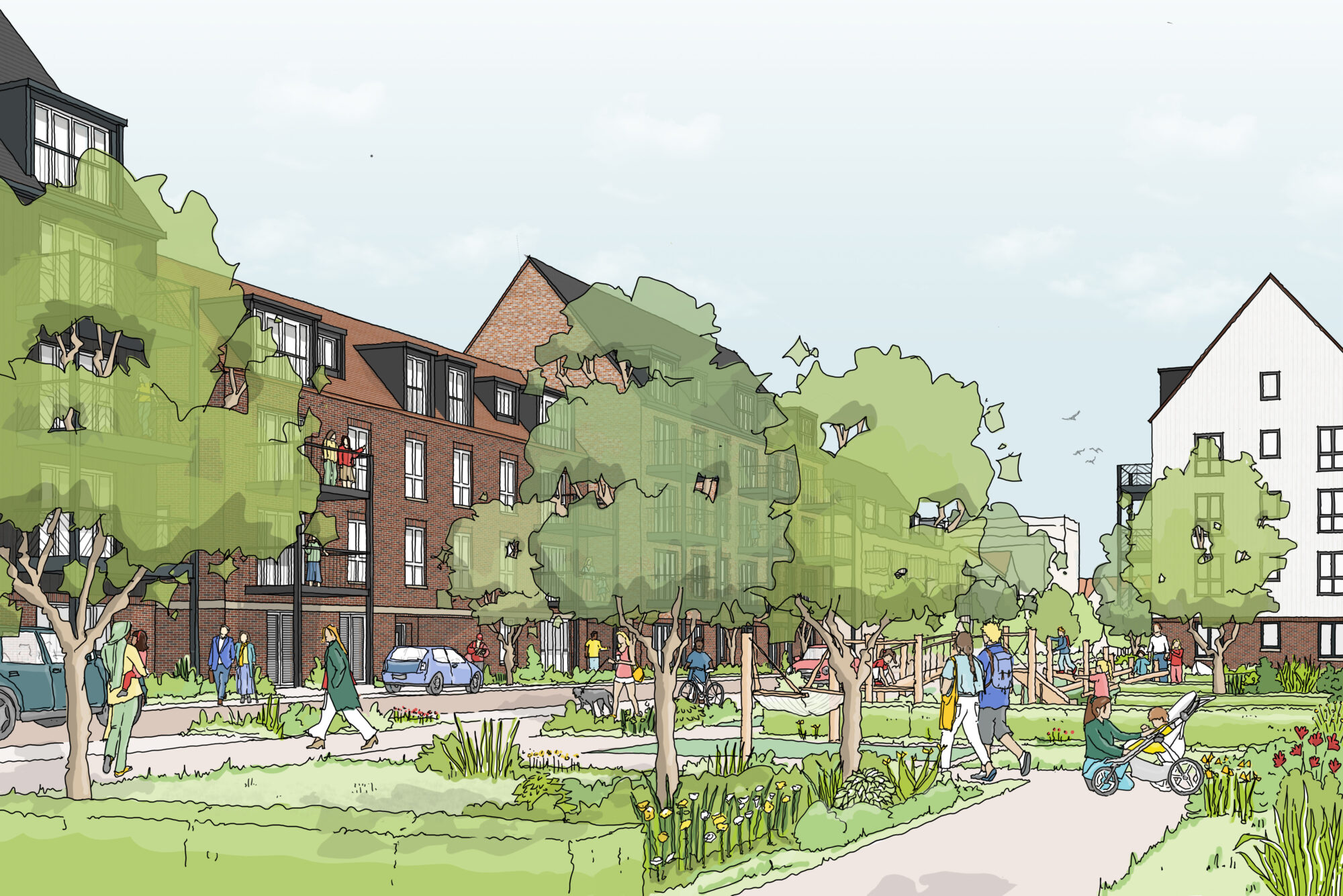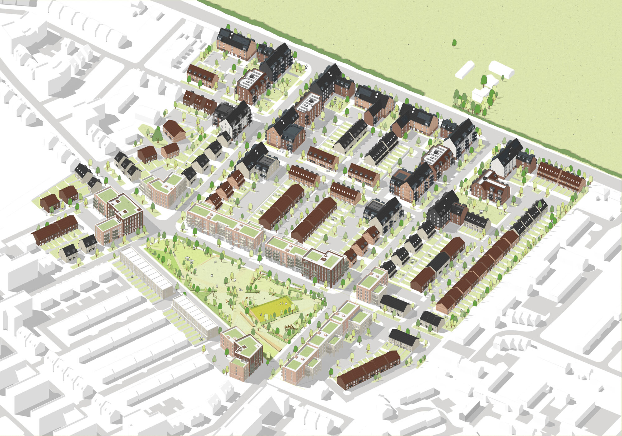 The first two sites (A & B) as part of BPTW’s transformative Masterplan for Bellway Homes at Billet Road in the LB of Redbridge were granted planning consent at committee in December. The consent amounts to 692 of the overall 1350 homes within the 20-hectare masterplan. The scheme features a range of 4 to 5-storey apartment buildings and individual family housing of various typologies creating an interesting interface between Greenbelt agricultural land and suburban London.