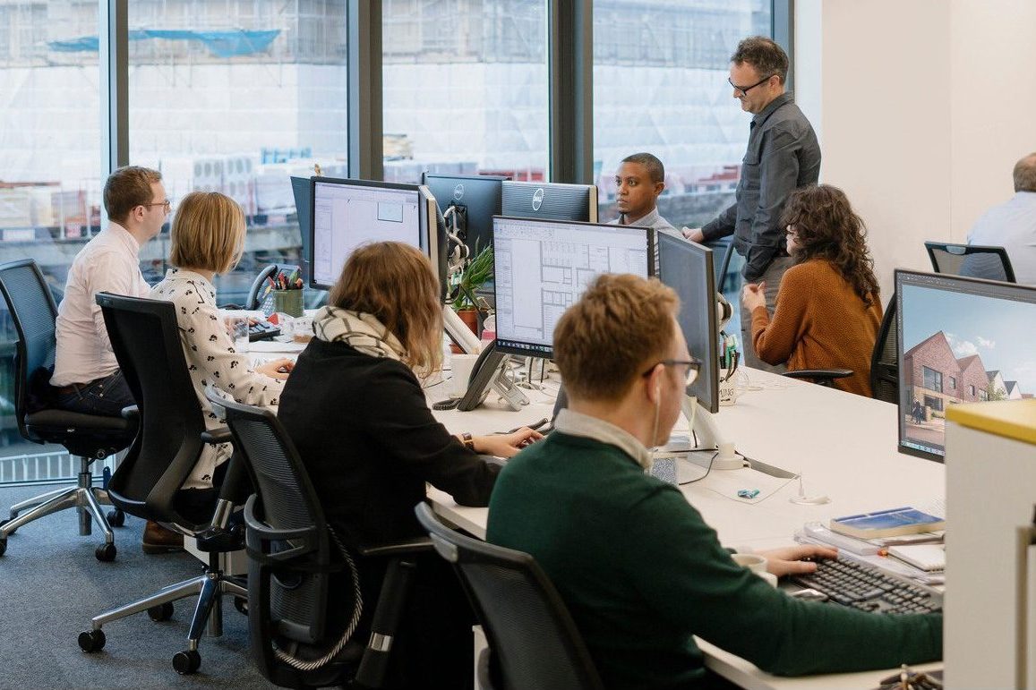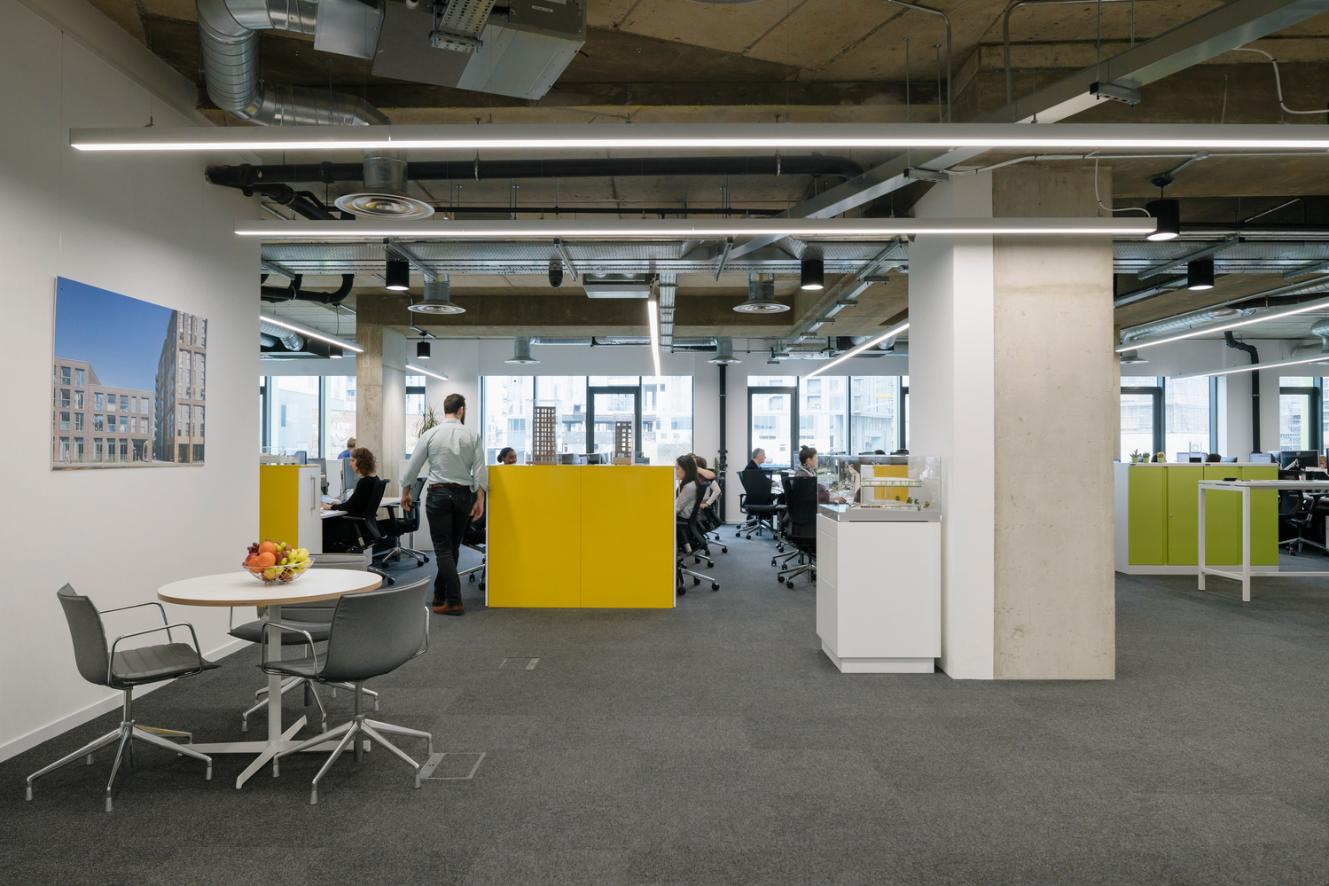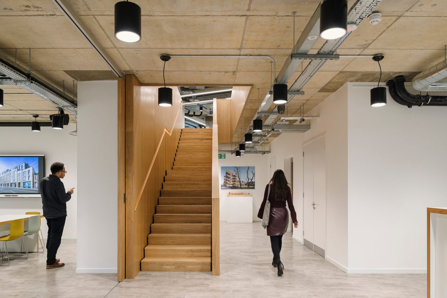 Our new studios provide welcoming creative spaces, meeting room facilities, a model making space, a café and creative hub for our 130-strong architecture and planning team. Sitting on the ground and first floor of Caledonian Point, the commercial space is enveloped by floor to ceiling windows, giving fantastic views across Deptford Creek. Upon entering, an elegantly detailed ‘timber-box’ stair aligns with the main entrance, drawing the eye upwards towards the first-floor work space. The open-plan studio layout is crucial as BPTW works on larger schemes, which involve the ever-expanding consultant teams working closely together. Alongside individual and group workstations, the design also has a strong focus on creating a variety of break-out spaces within the plan for informal design meetings. Throughout the building colour has been introduced through furniture and wall and floor coverings in the meeting rooms, adding to the vibrancy of the well-lit spaces.
