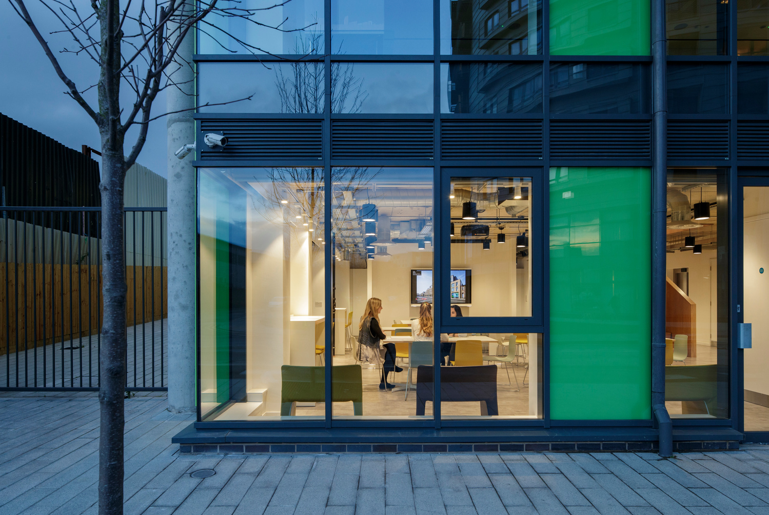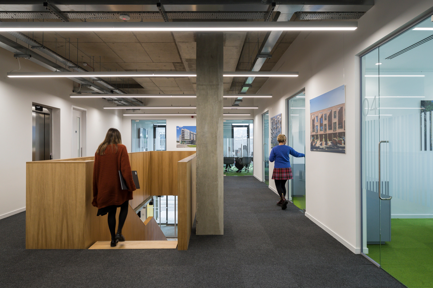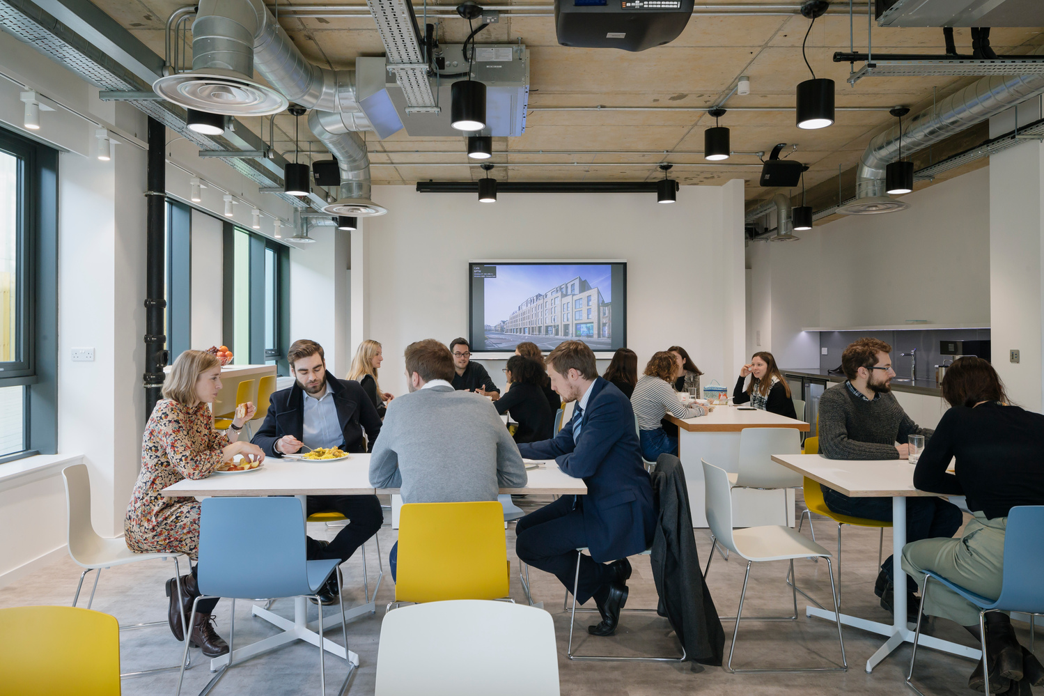 Our new studios provide welcoming creative spaces, meeting room facilities, a model making space, a café and creative hub for our 130-strong architecture and planning team. Sitting on the ground and first floor of Caledonian Point, the commercial space is enveloped by floor to ceiling windows, giving fantastic views across Deptford Creek. Upon entering, an elegantly detailed ‘timber-box’ stair aligns with the main entrance, drawing the eye upwards towards the first-floor work space. The open-plan studio layout is crucial as BPTW works on larger schemes, which involve the ever-expanding consultant teams working closely together. Alongside individual and group workstations, the design also has a strong focus on creating a variety of break-out spaces within the plan for informal design meetings. Throughout the building colour has been introduced through furniture and wall and floor coverings in the meeting rooms, adding to the vibrancy of the well-lit spaces.