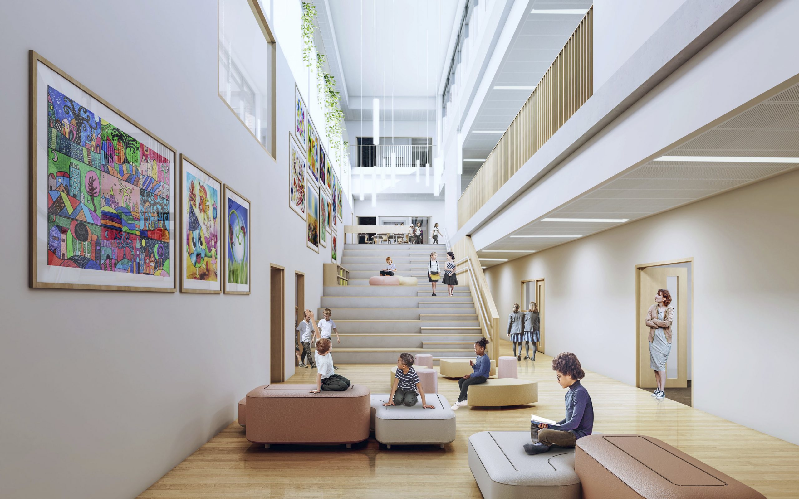 Avonmore will be a net-zero development designed to achieve a 74% reduction in operational carbon and a 26% contribution to a carbon offset fund. Other sustainable features include green roofs on all buildings, new tree planting in the community and 100 new solar panels. The school achieves BREEAM Excellent Standards.