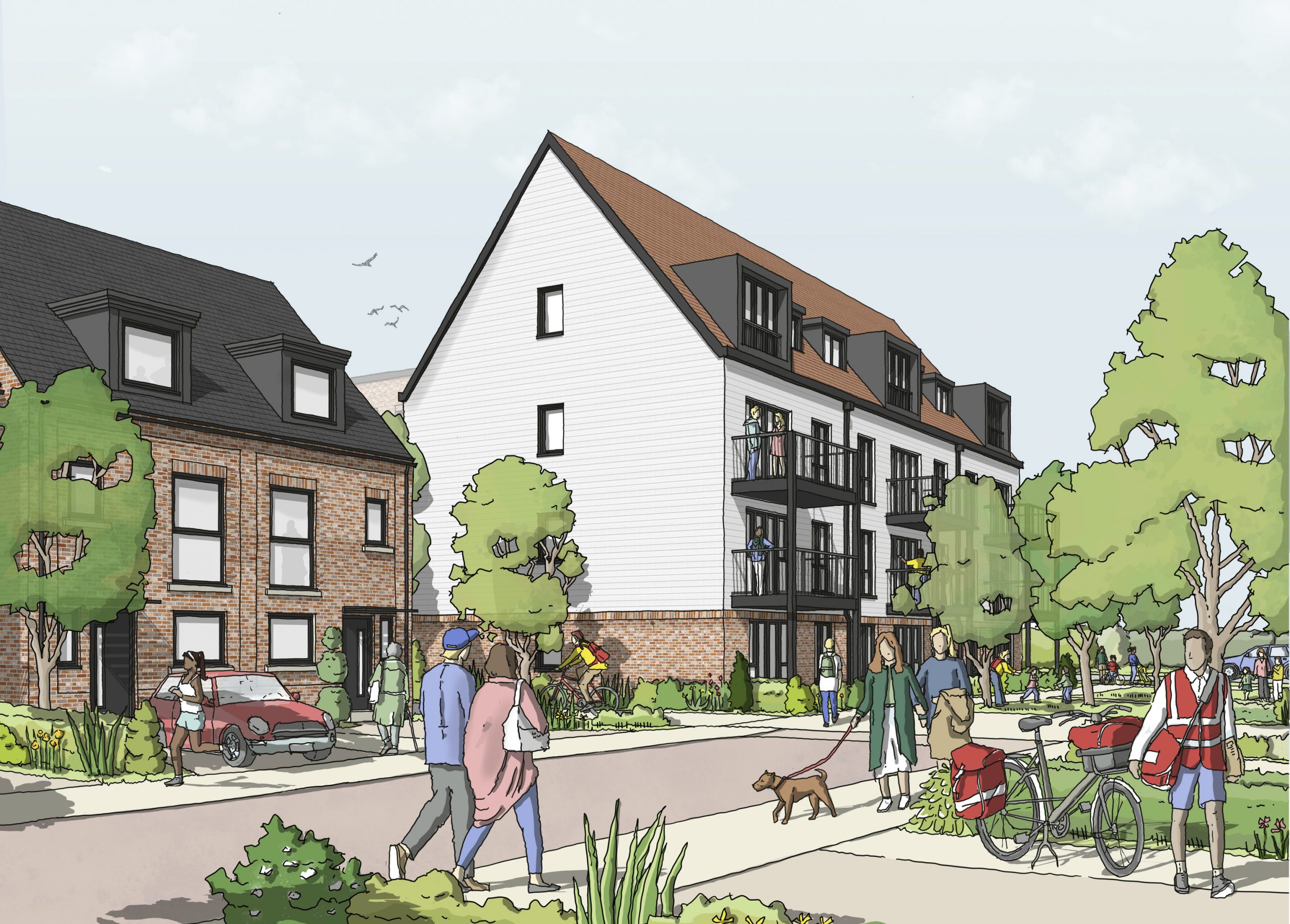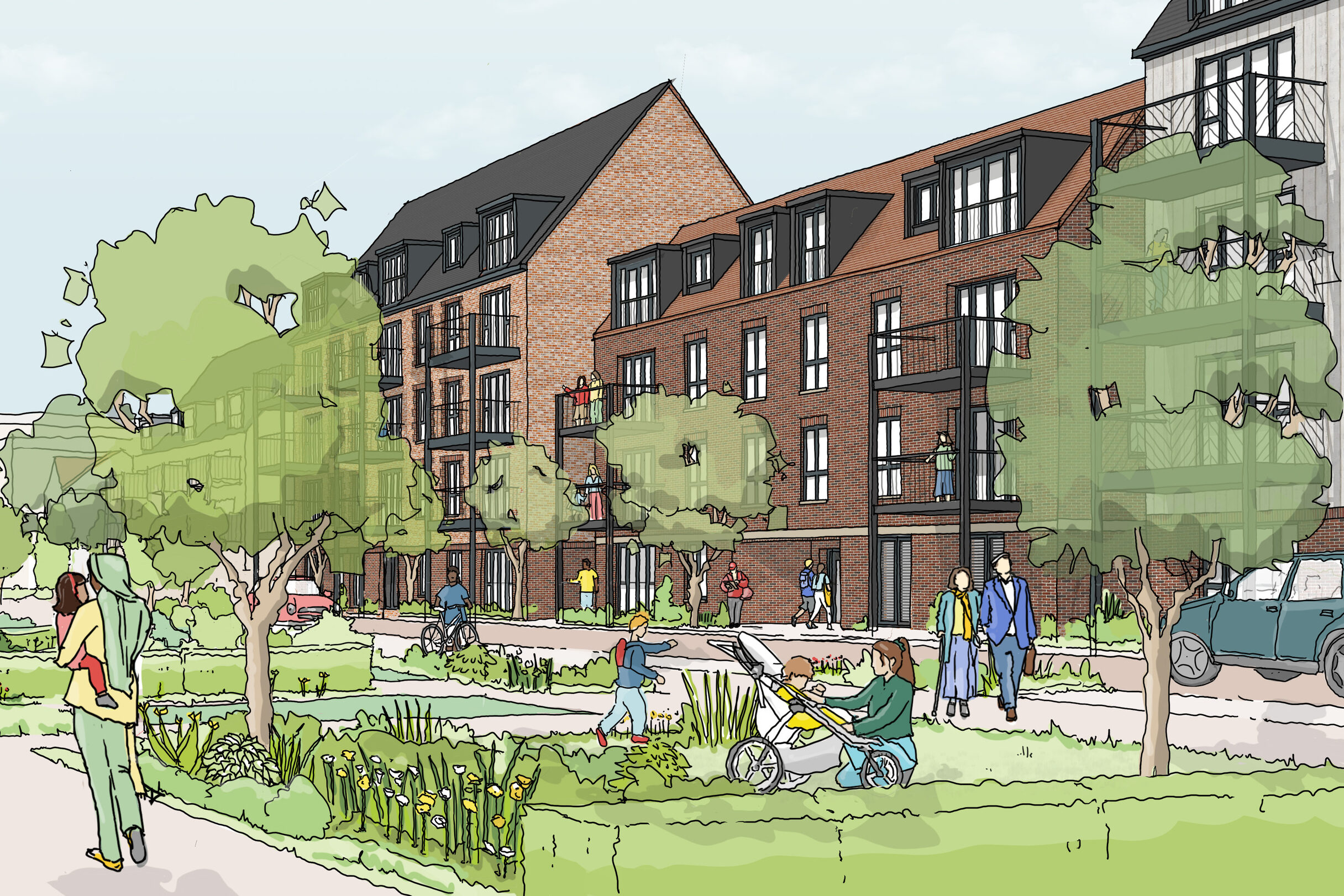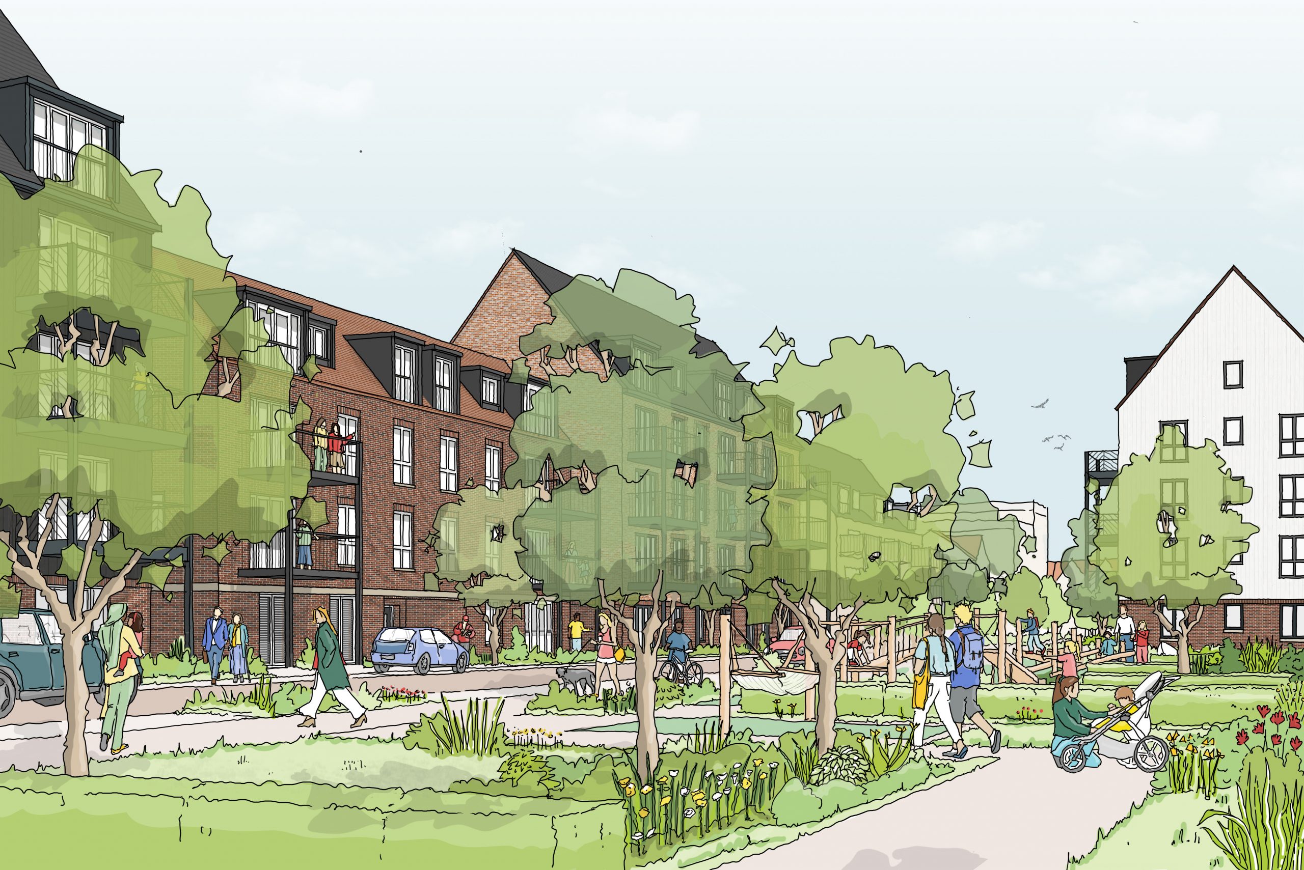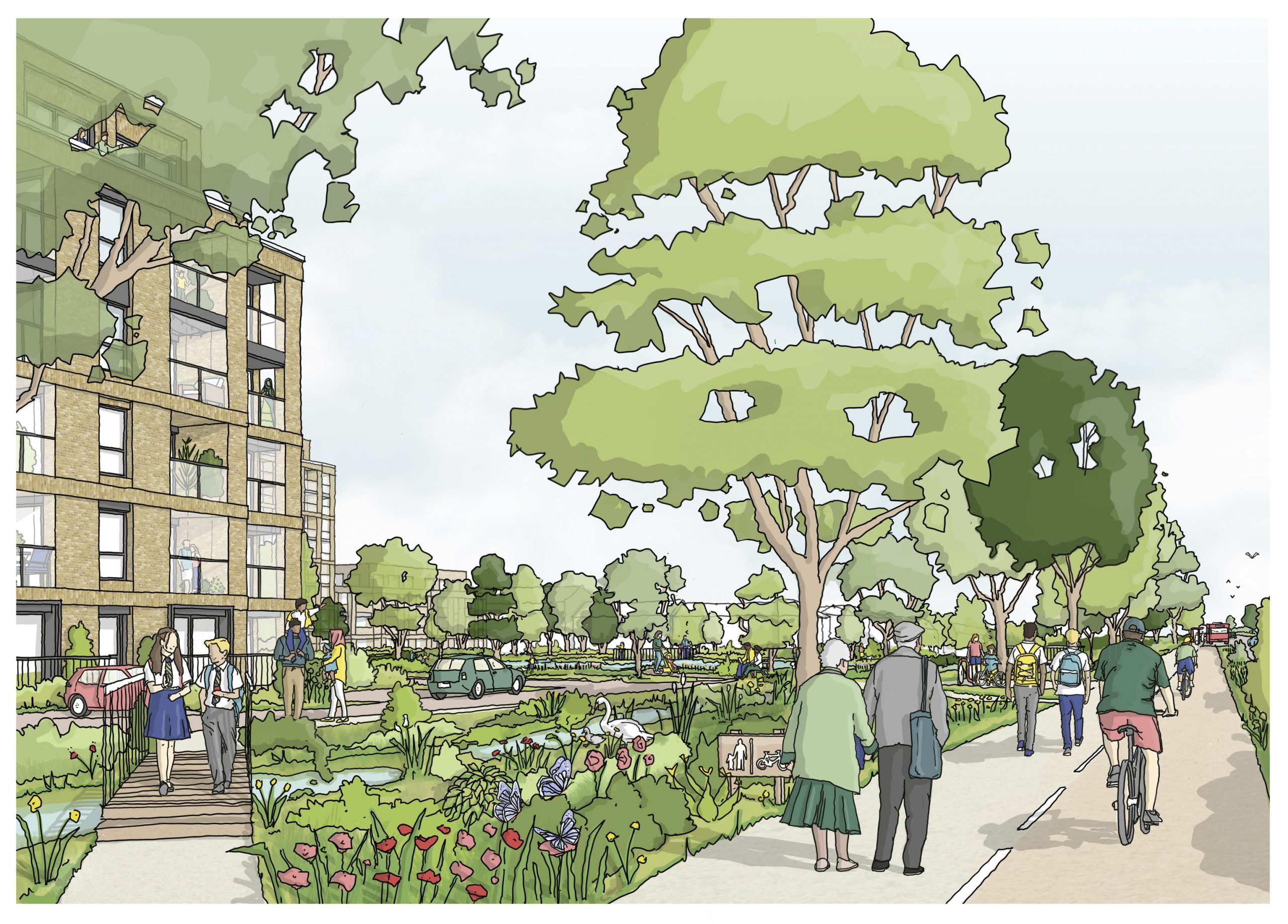 To create a sustainable neighbourhood, the landscape-led masterplan establishes design principles for a connected blue and green infrastructure network, a place where people choose active and public transport, future-proofed wider area connections and passive and active sustainable measures such as orientation and an energy centre.