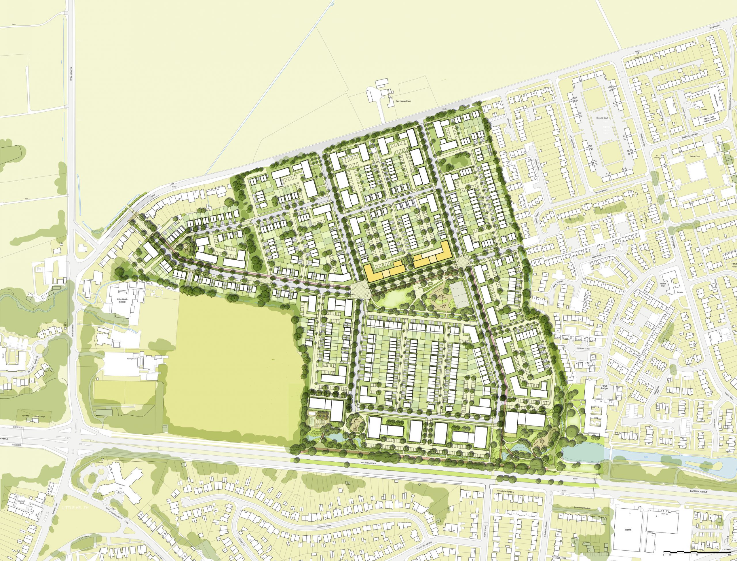 The masterplan is defined by a transition from the rural to the urban so that the new neighbourhood celebrates its surrounding context. A series of key spatial moves is embedded within the layout by a connected network of avenues and boulevards, integrated open space network centred on a new central park with local community hub and a series of welcoming gateways and new frontages to surrounding streets Three well-defined character areas contribute to defining a local character addressing height and massing, landscape character, marker buildings, and materials and detailing to guide local placemaking.
