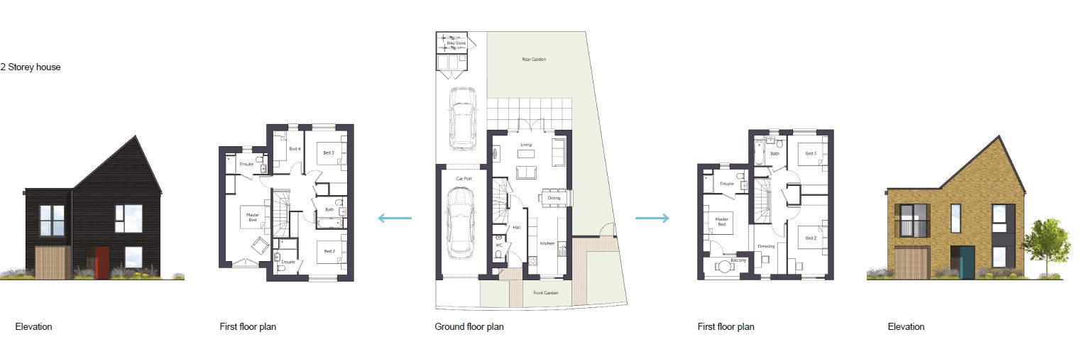 Because of the range of approaches demonstrated in the previous phases, Newhall is characterised by a diverse townscape, reminiscent of the variation found as a result of organic expansion in more traditional settlements. Similarly, BPTW’s design for CP2A seeks to blend a series of ‘village clusters’ into the established urban grain and context of the existing phases, helping to create a unified townscape and community. Building upon Newhall’s strong identity and reputation, BPTW’s design achieves character and identity by combining standard floor plans with bespoke elevations that respond thoughtfully to the site’s context and constraints. Architectural inspiration was drawn from historic streets in Old Harlow – the original settlement – when developing the material palette and a contemporary interpretation of traditional proportions, forms and details.