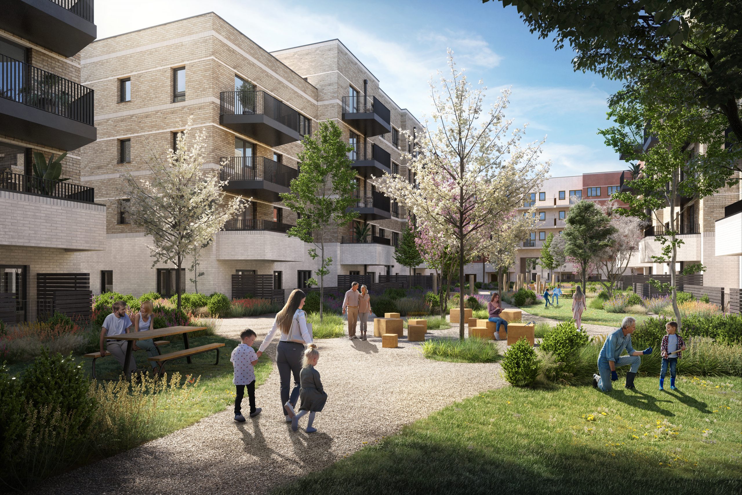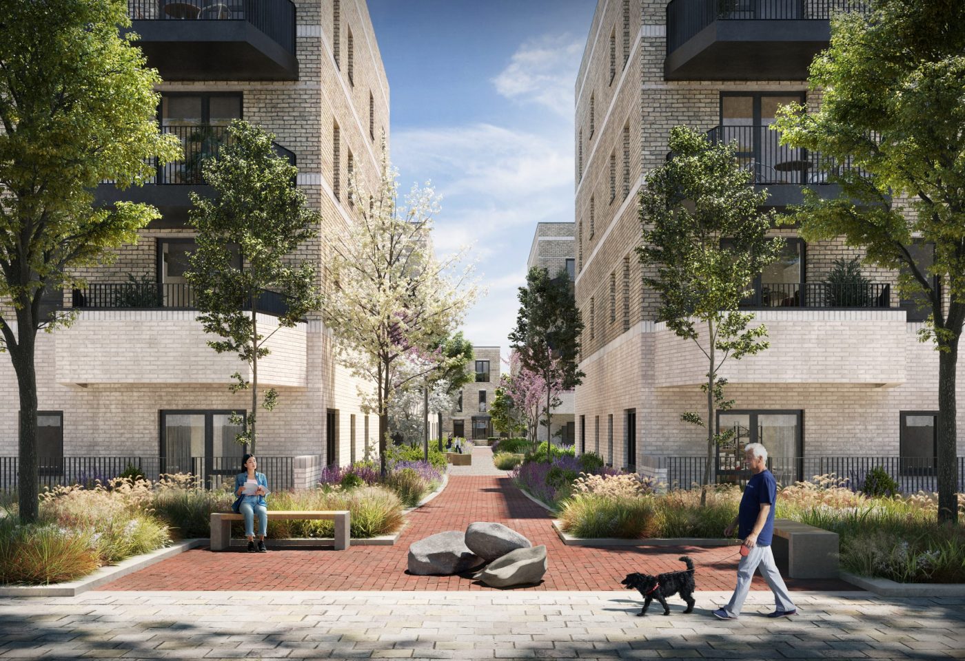 Appointed by Clarion Housing Group, BPTW secured planning permission for this reserved matters application in 2019 with unanimous approval at committee. The masterplan has been carefully arranged into three distinct character areas, known as the gateway, the courtyard, the street and the mews. Each of these unique areas has a distinct architectural language inspired by the art deco surroundings that defines the new apartments and houses. They are then united into a cohesive masterplan and connected to the surrounding urban context with a considered landscaping and public realm strategy, which includes an ecological corridor and integrated parking.
