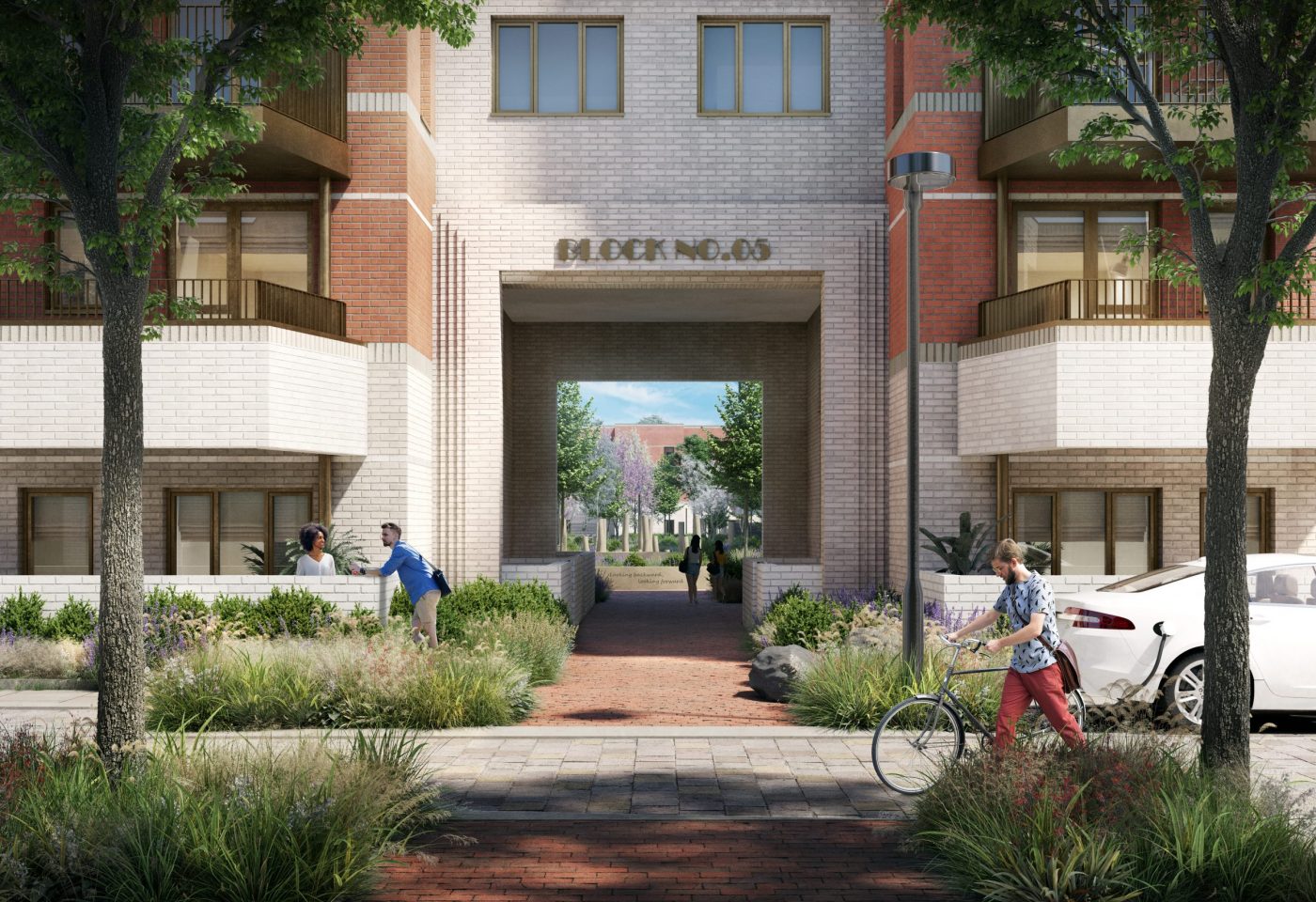 Building height and positioning are used as defining urban design principles. The tallest buildings are designed as placemaking landmarks to shape the new neighbourhood, creating gateways to courtyards and framing street corners. The lower rise terraced and mews houses boarder the masterplan and provide individual front doors to the streets that introduce a domestic scale. Courtyards positioned centrally within the site offer a focus on greenery and landscaping for residents to enjoy. By analysing and reinterpreting key architectural elements from the local art deco context, such as entrances, windows and façade details, BPTW’s design and material palette is rooted in the local sense of place.