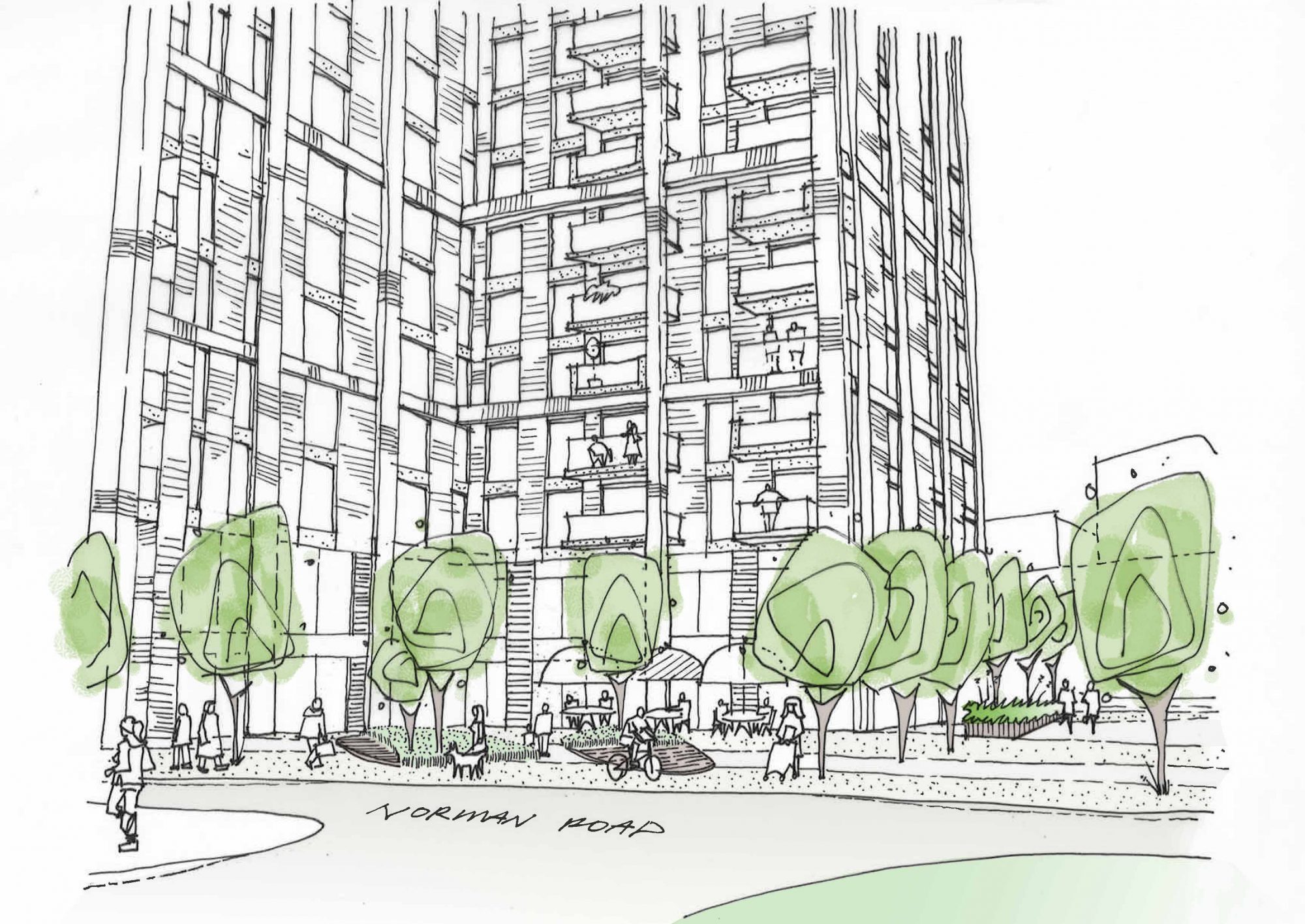 A distinct series of spaces includes a plaza providing relief to Norman Road and leading on to a boulevard, forming a link to the creek beyond. The promenade then flows up to the upper ground level in the form of a private podium providing residents with a more intimate external setting.