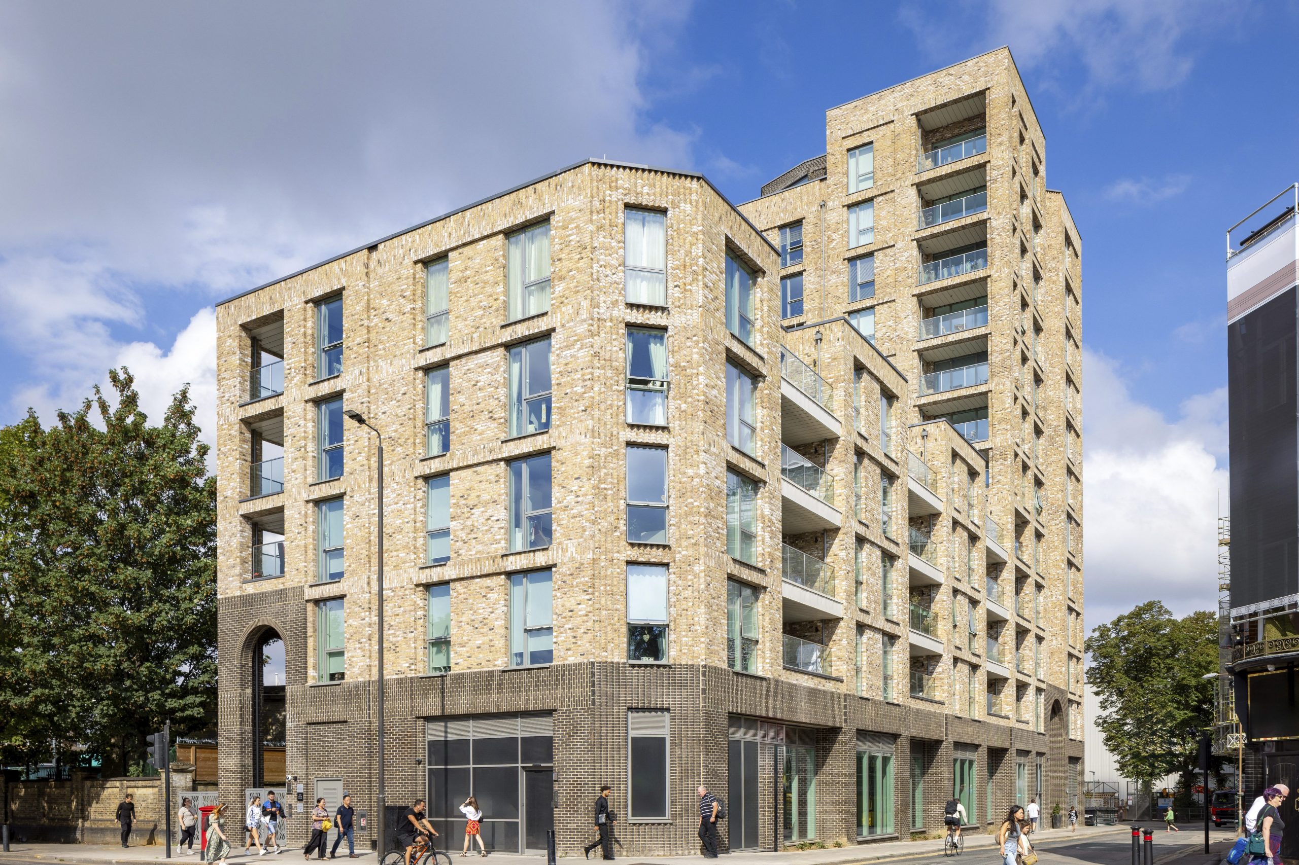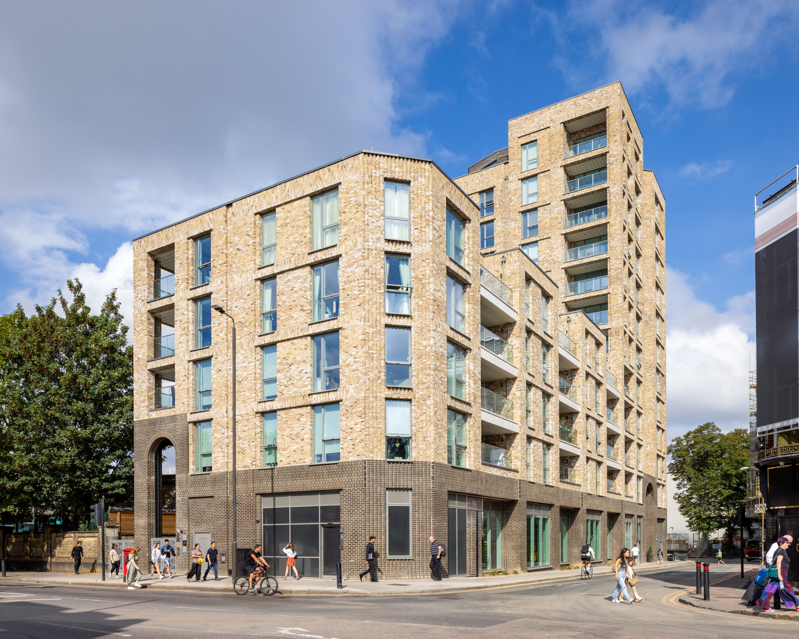 The chamfered corner design is inspired by the prominent features of historic buildings in Greenwich. The tall archways at Valegro’s entrances and the colour and detailing of the brick respect the quality of the beautiful arched windows and brickwork of the Listed Wall and Pumping Station next door to the development.