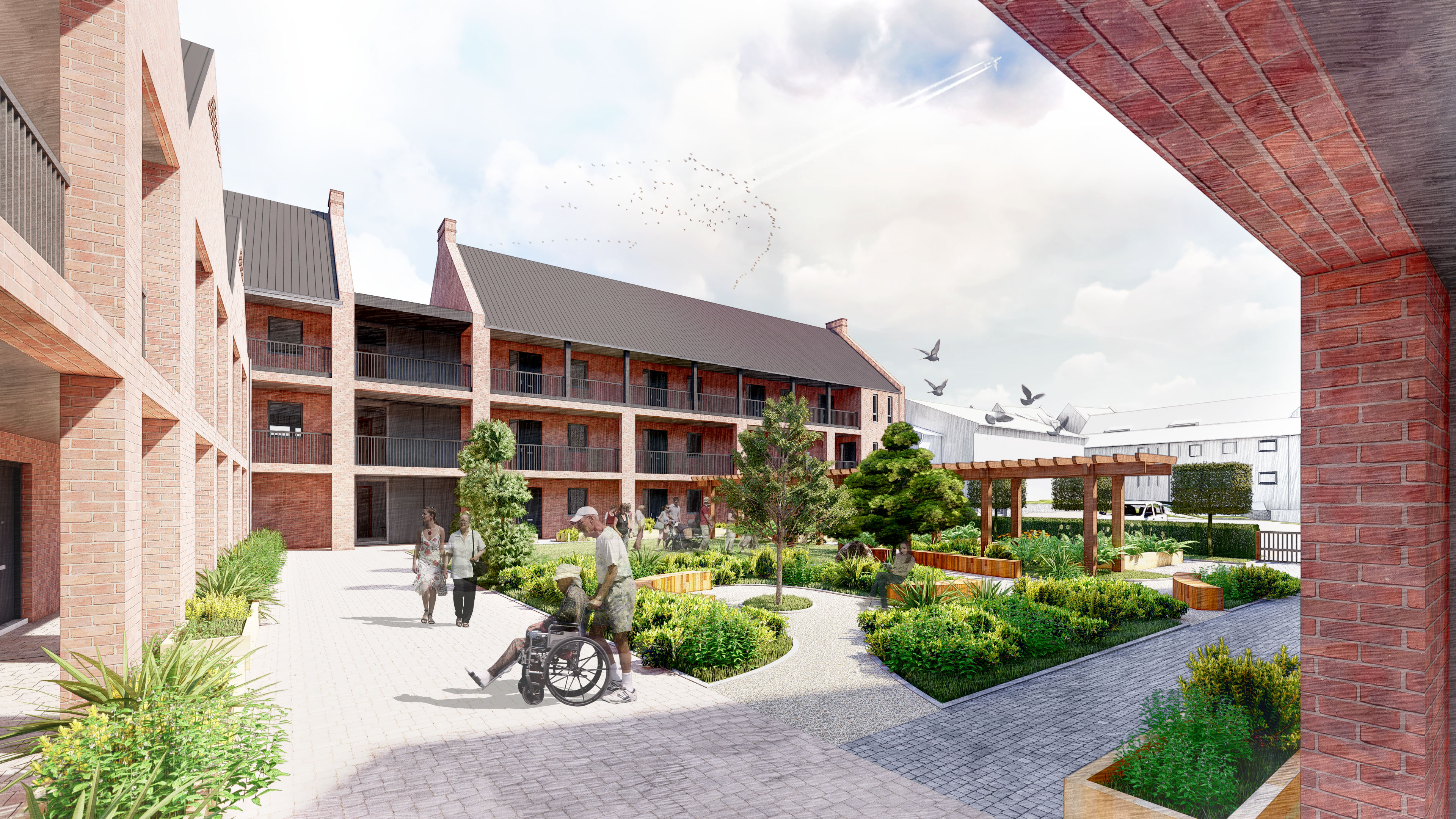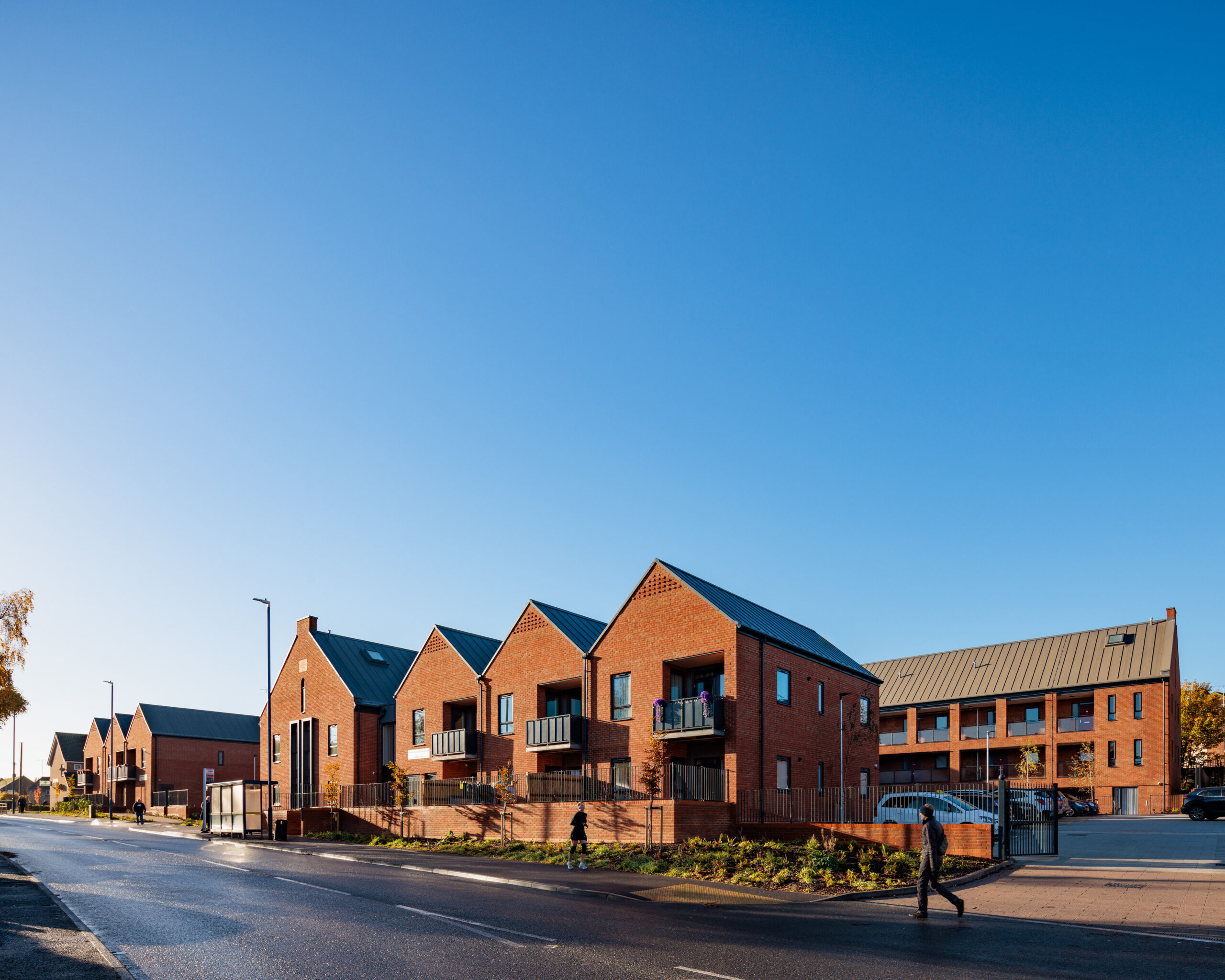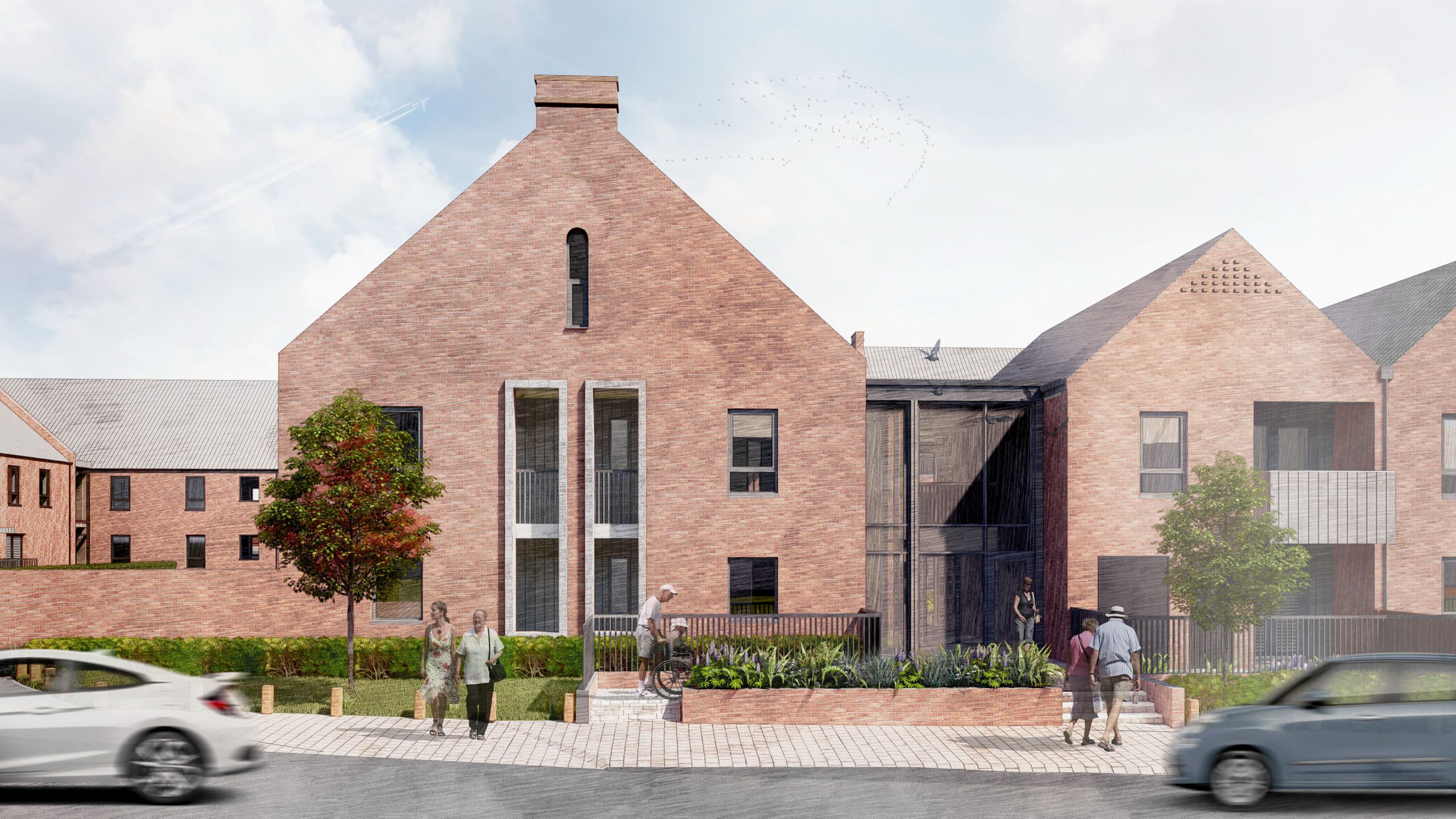 Praised at committee as ‘a very good example of a well thought out proposal of high-quality design’, the scheme’s well-mannered response to the adjacent semi-detached, mainly 2-storey homes, sees it emulate these in height, with the addition of one 3 storey wing in the independent housing block. Referencing the traditional roofs typically found in the area, a gently varied pitched roofscape brings these blocks together, with flat roofs over the stairs and lifts subtly dividing the building form.