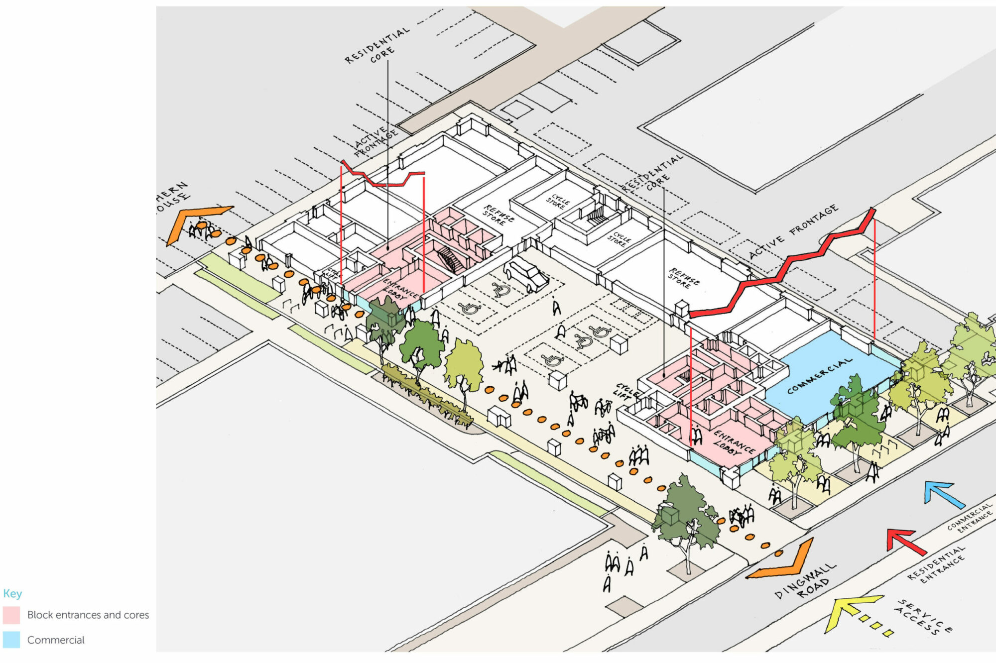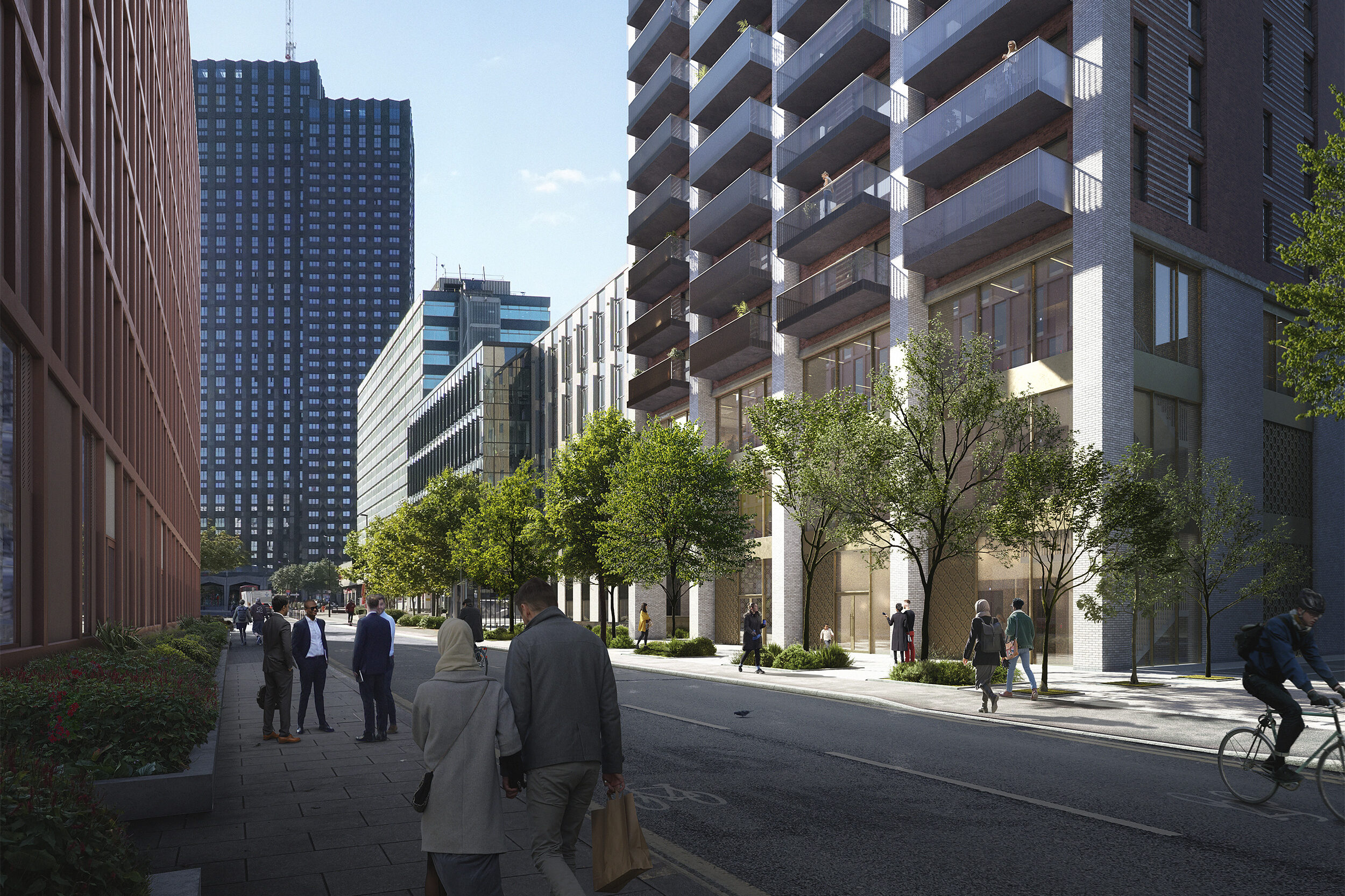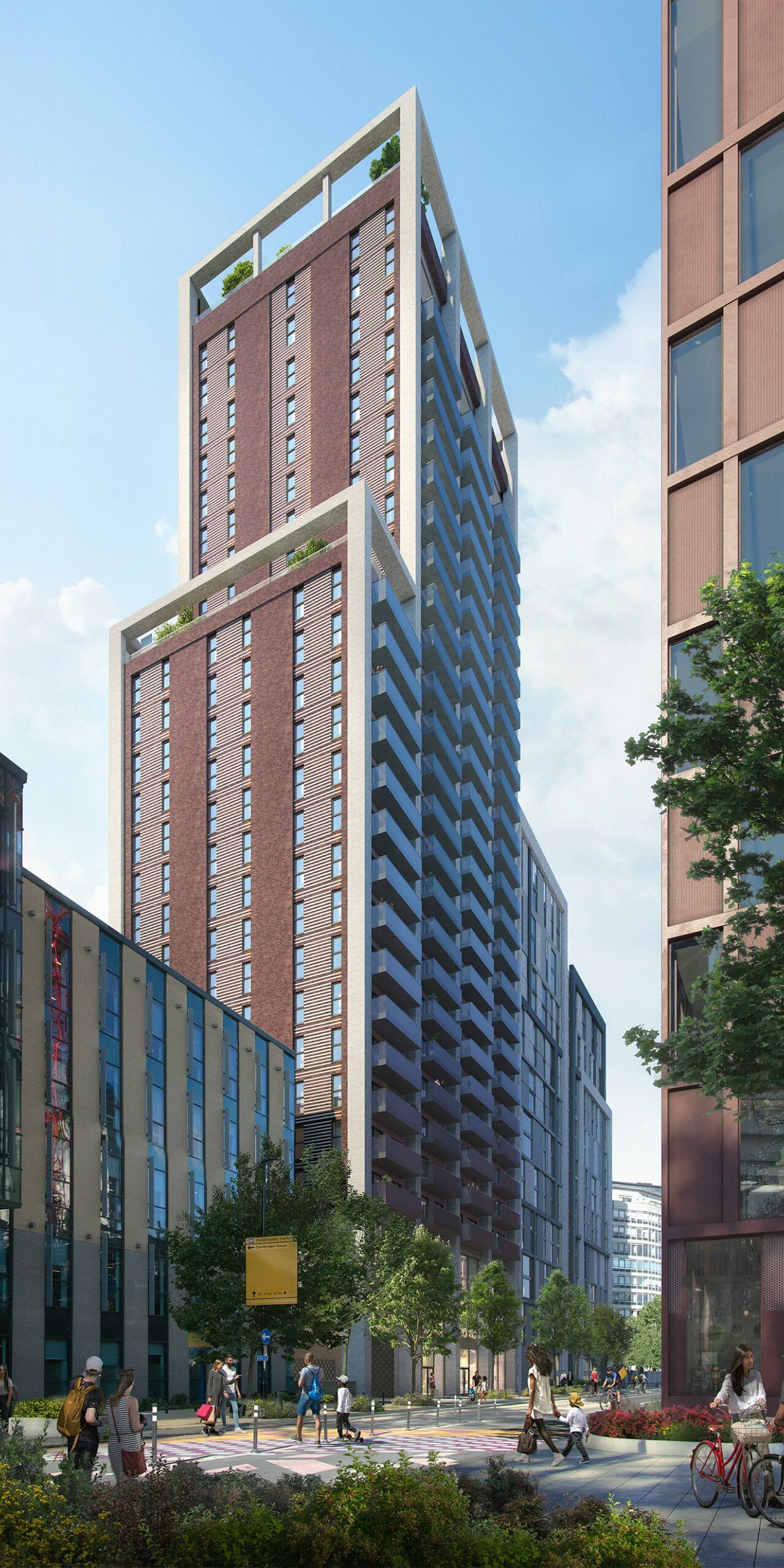 BPTW’s design for Vista creates 199 mixed-tenure apartments across two nine- and 28-storey buildings connected by a landscaped podium. The scheme creates an active street frontage onto a major local road and Ruskin Square with a new healthcare centre, residential entrance and gym that form the development’s first three storeys.