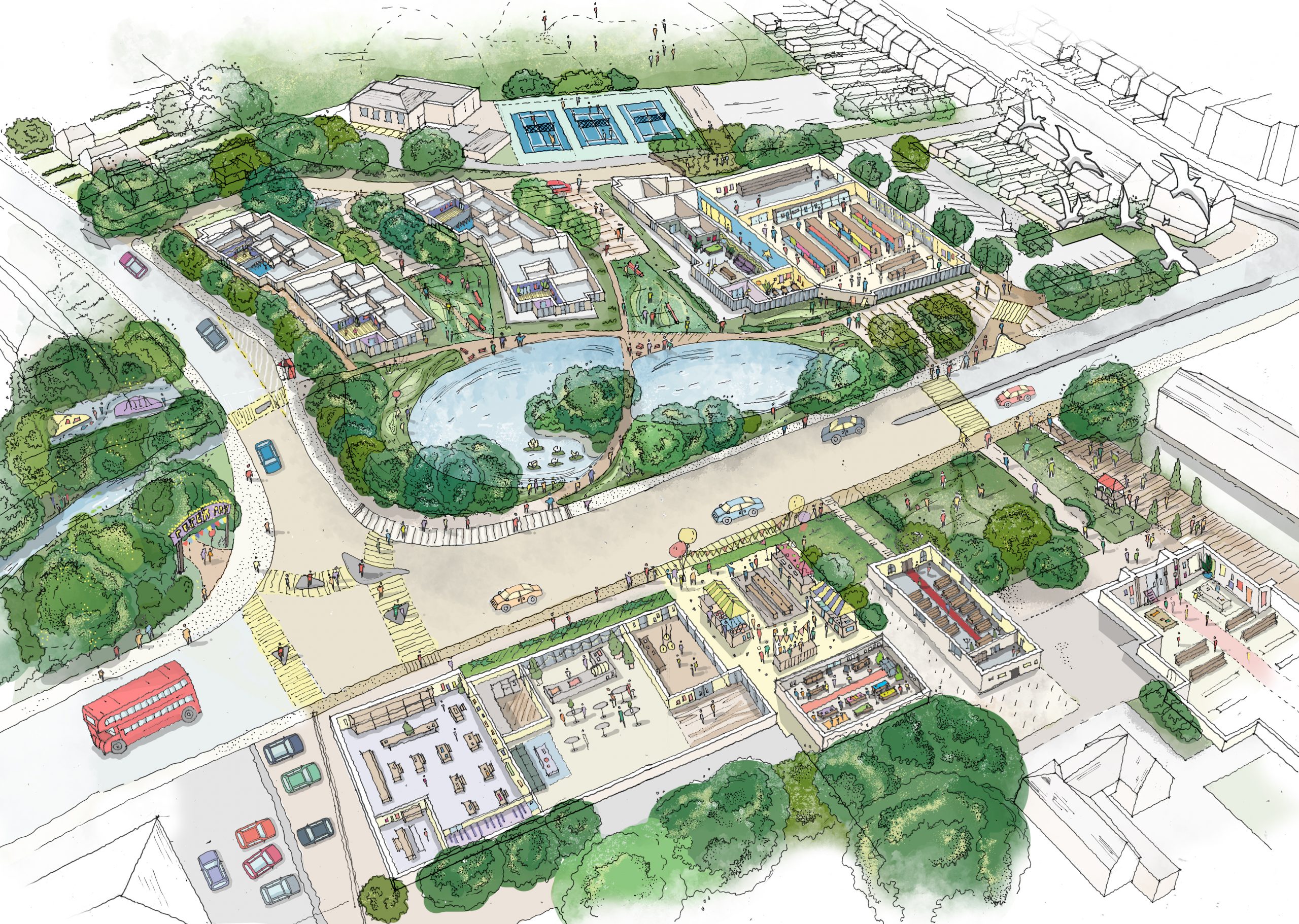 Aerial sketch of South London scheme showing a mix of active uses at street level.