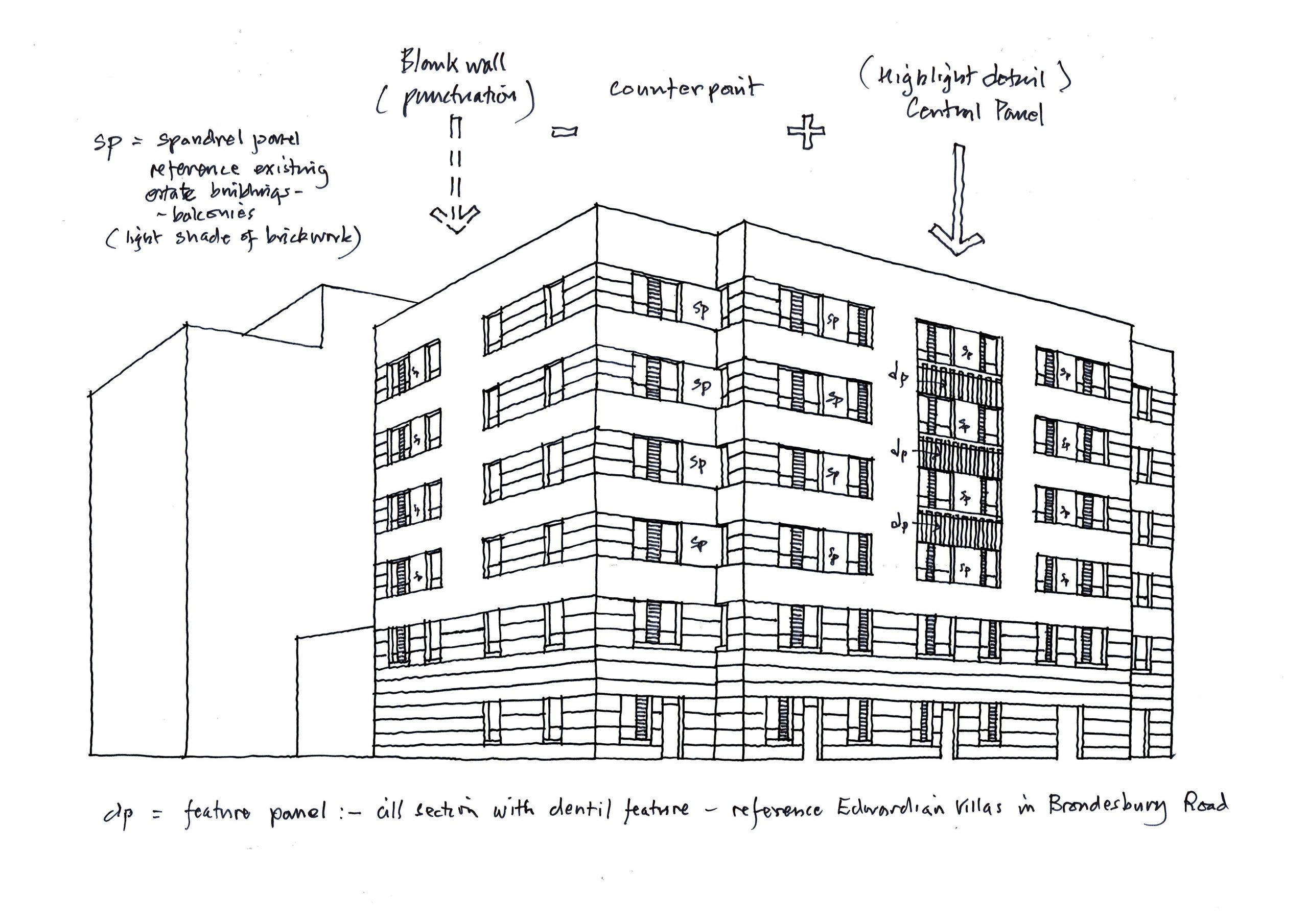 Series of concept sketches showing an arched feature highlighting the entrance for an assisted living project. The drawings explore the elevational treatment of a block where wider doors have been provisioned for wheelchair and buggy access. The project also incorporates contemporary references to Art Deco architecture, hence the emphasis on symmetry and horizontal grouping of the windows.