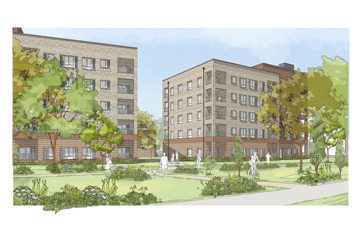 BPTW’s design for Chapel Gate in Basildon includes apartment buildings set in a network of landscaped spaces that offer green amenities and pedestrian and cycle access to the adjacent town centre.